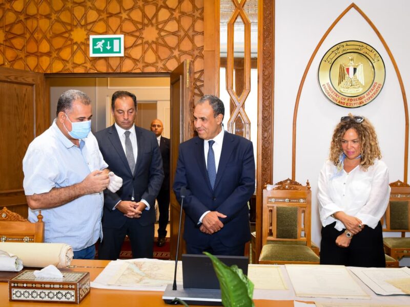 اطلع دكتور بدر عبد العاطى وزير الخارجية والهجرة وشئون المصريين بالخارج , اليوم الأحد , سير العمل فى تنفيذ خطة الوزارة لتوثيق المستندات ذات القيمة التاريخية والتي تعود بعضها إلى قرون، واستمع فى هذا الاطار الى شرح تفصيلى عن عمليات الترميم والحفظ، وذلك تمهيداً لعرضها بمتحف جديد بوزارة الخارجية , وذلك فى إطار جهود وزارة الخارجية فى ترميم الوثائق والمعاهدات الدولية التي أبرمتها مصر مع الدول الأجنبية، وترميم المراجع والخرائط ذات القيمة التاريخية التي تمتلكها الوزارة .