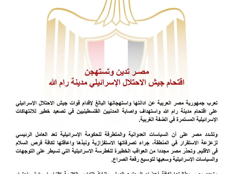 ” تعرب جمهورية مصر العربية عن ادانتها واستهجانها البالغ لإقدام قوات جيش الاحتلال الإسرائيلي على اقتحام مدينة رام الله واستهداف واصابة المدنيين الفلسطينيين في تصعيد خطير للانتهاكات الإسرائيلية المستمرة في الضفة الغربية.
