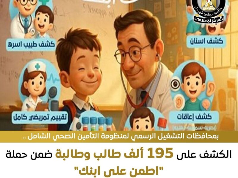 نجحت حملة “اطمن على ابنك ” للفحص الطبي على طلاب المدارس للعام الدراسي 2026/2025، في الكشف على 195 ألف طالب وطالبة حتى الآن بمحافظات التشغيل الرسمي لمنظومة التأمين الصحي الشامل الخمس «بورسعيد، الأقصر، الإسماعيلية، جنوب سيناء، السويس»، بنسبة إنجاز بلغت 76% من إجمالي المستهدف، والذي يصل إلى 257 ألف طالب وطالبة.
